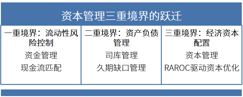資本管理的三重境界躍遷:從應(yīng)對流動性危機(流動性風險控制)、到加強司庫建設(shè)(資產(chǎn)負債管理)、至追求資本使用效率最大化(經(jīng)濟資本配置)。