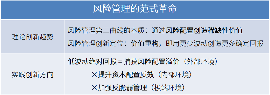 總結(jié)而言,風險管理第三曲線的本質(zhì)是通過風險配置創(chuàng)造稀缺性價值,實現(xiàn)“低波動、絕對回報”。