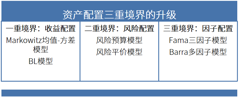 資產(chǎn)配置的三重境界升級:從追求收益(收益配置)、到平衡風險調(diào)整后收益(風險配置)、至捕捉驅(qū)動阿爾法的底層風險因子(因子配置)。
